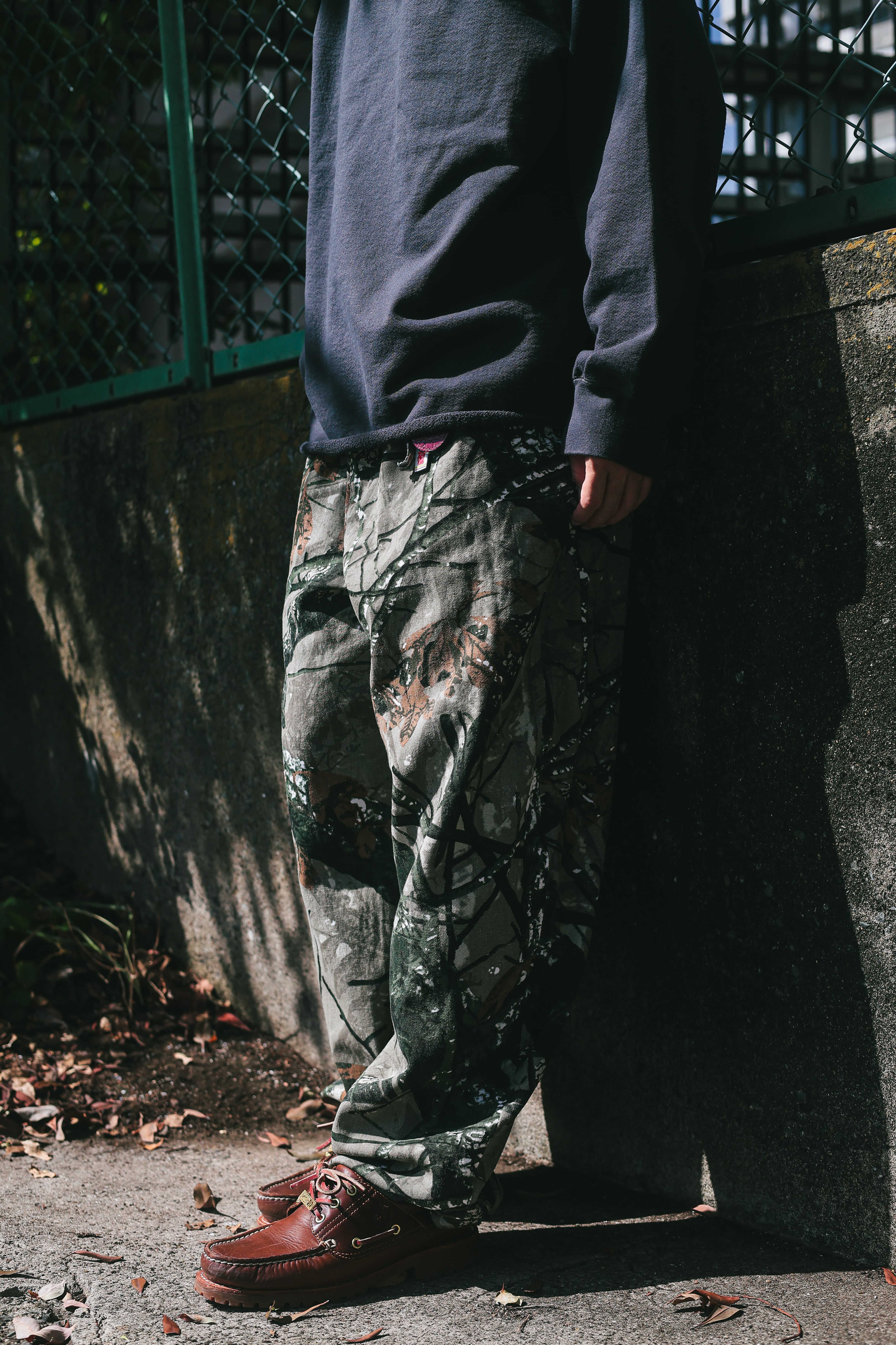 リアルツリーのパンツって丁度良いシルエット、柄、素材の物って意外と見つかりずらかったりするんですけどこれはどれ取っても良い。トラックパンツ風なシルエットでサイドはZIP付きベンチレーション搭載。キーループも付いてるので鍵やポーチをぶら下げる事も可。裾にはドローコードも付いてるので裾を引きずる心配もないという痒いところに手の届いてるカモパンになります。