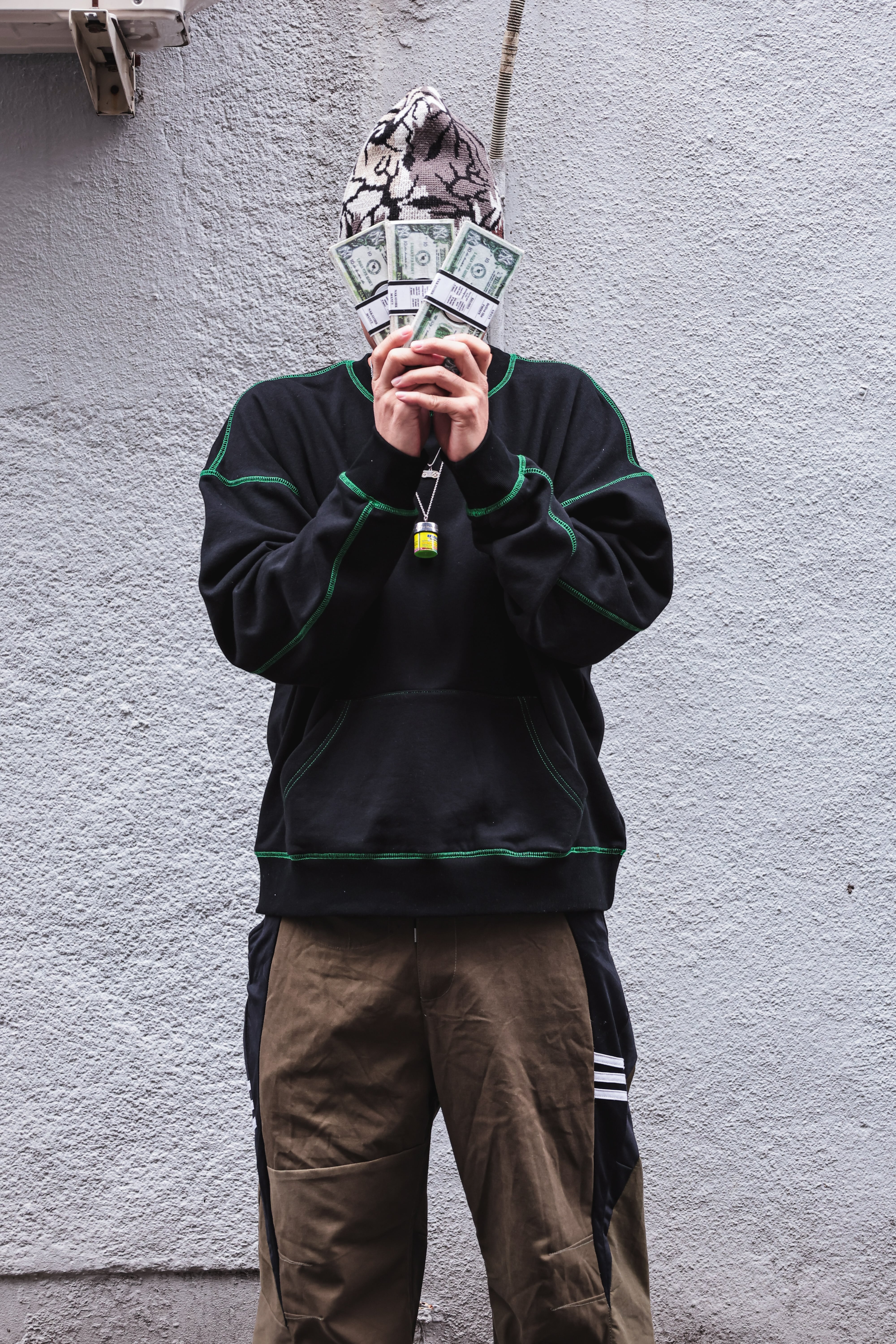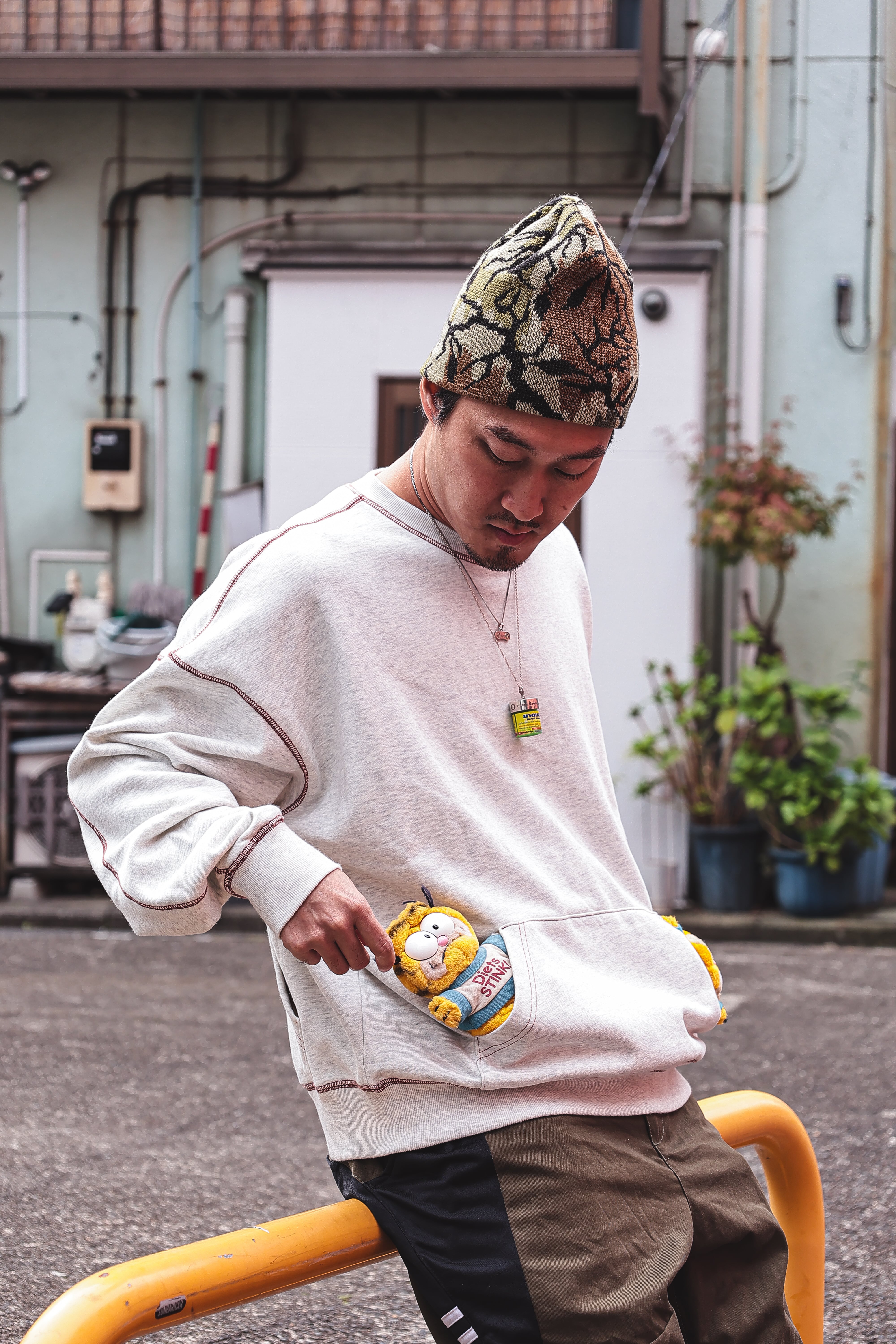 台湾のDeMarcoLabから面白い仕様のスウェットが入ってます。シンプルながらカンガルーポケットが前にも後ろにも付いてます。前後間違えて着ちゃってるみたいに思われてしまいそうな遊びが効いたクルーネックです。