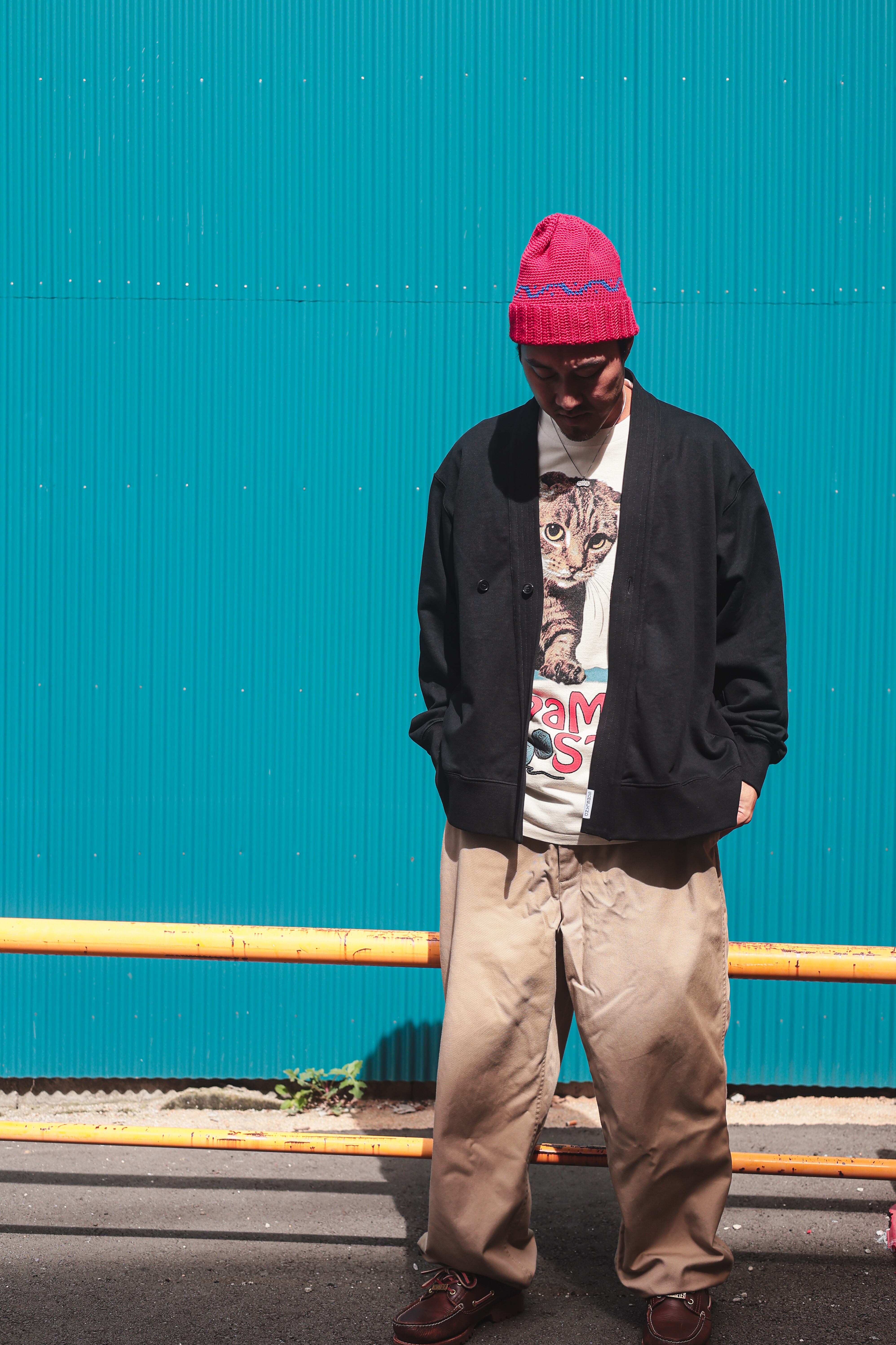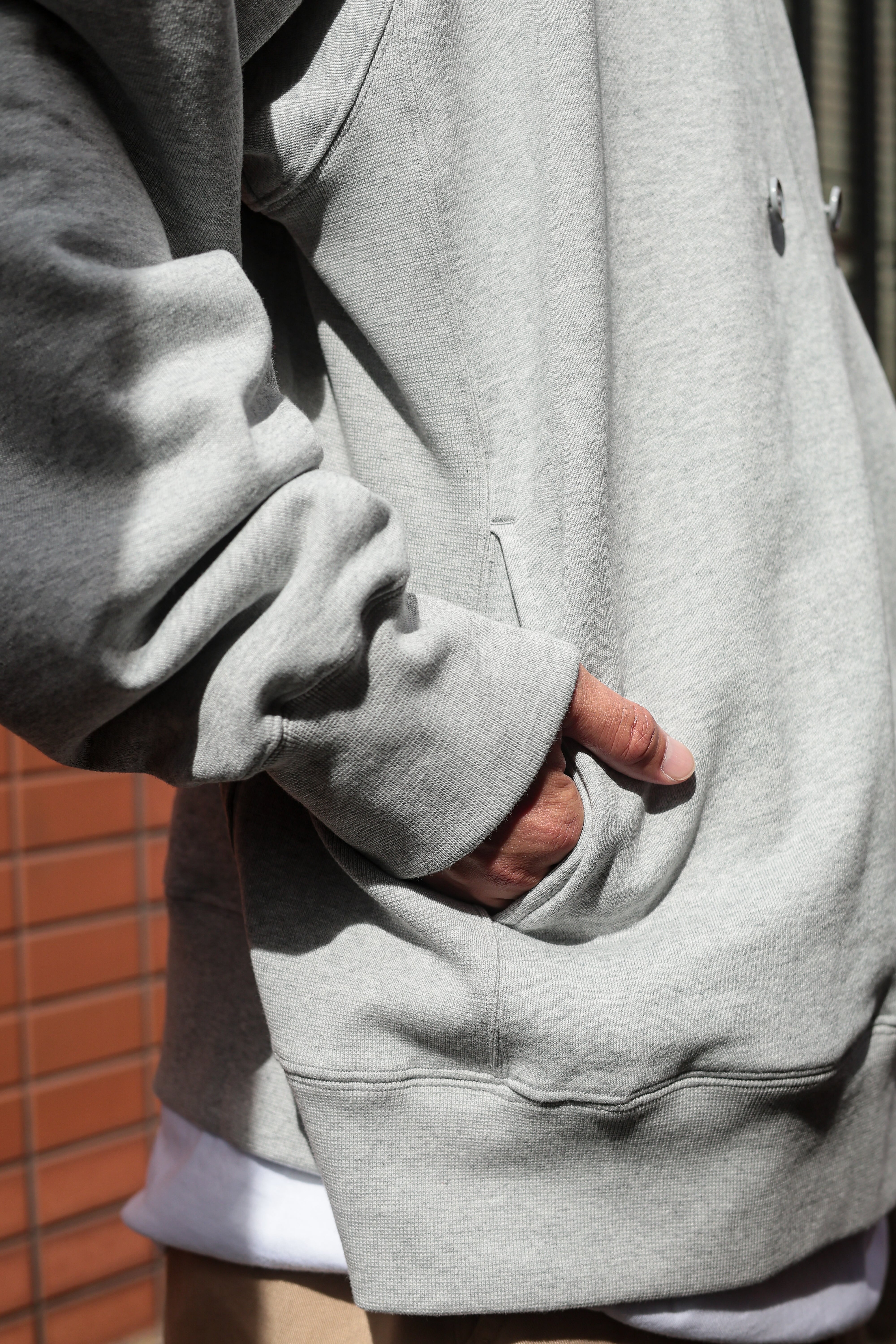 こちらはフロントにボタンが2つ付いていて外側の方に留めると道着の様な少し和なテイストに。真ん中のボタンに留めるとカーディガンな感じで着てもらえるかなと思います。ボタンを留めずに羽織ってもらっても勿論良し。