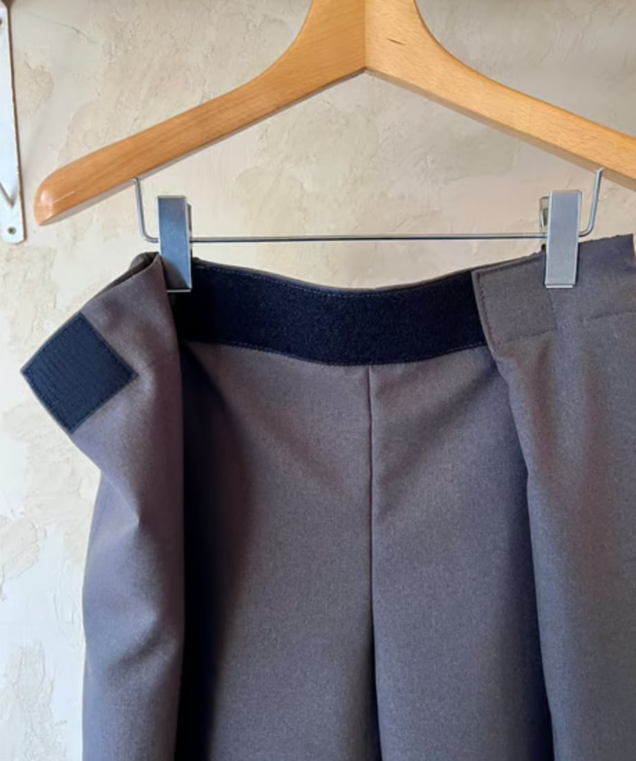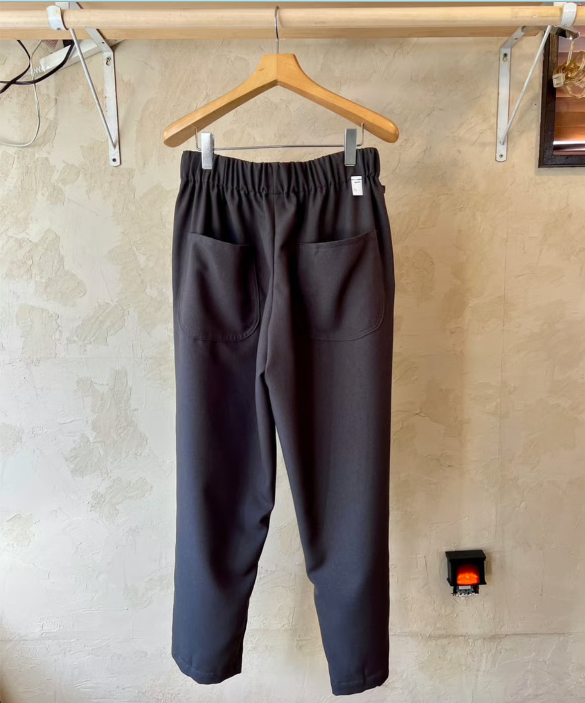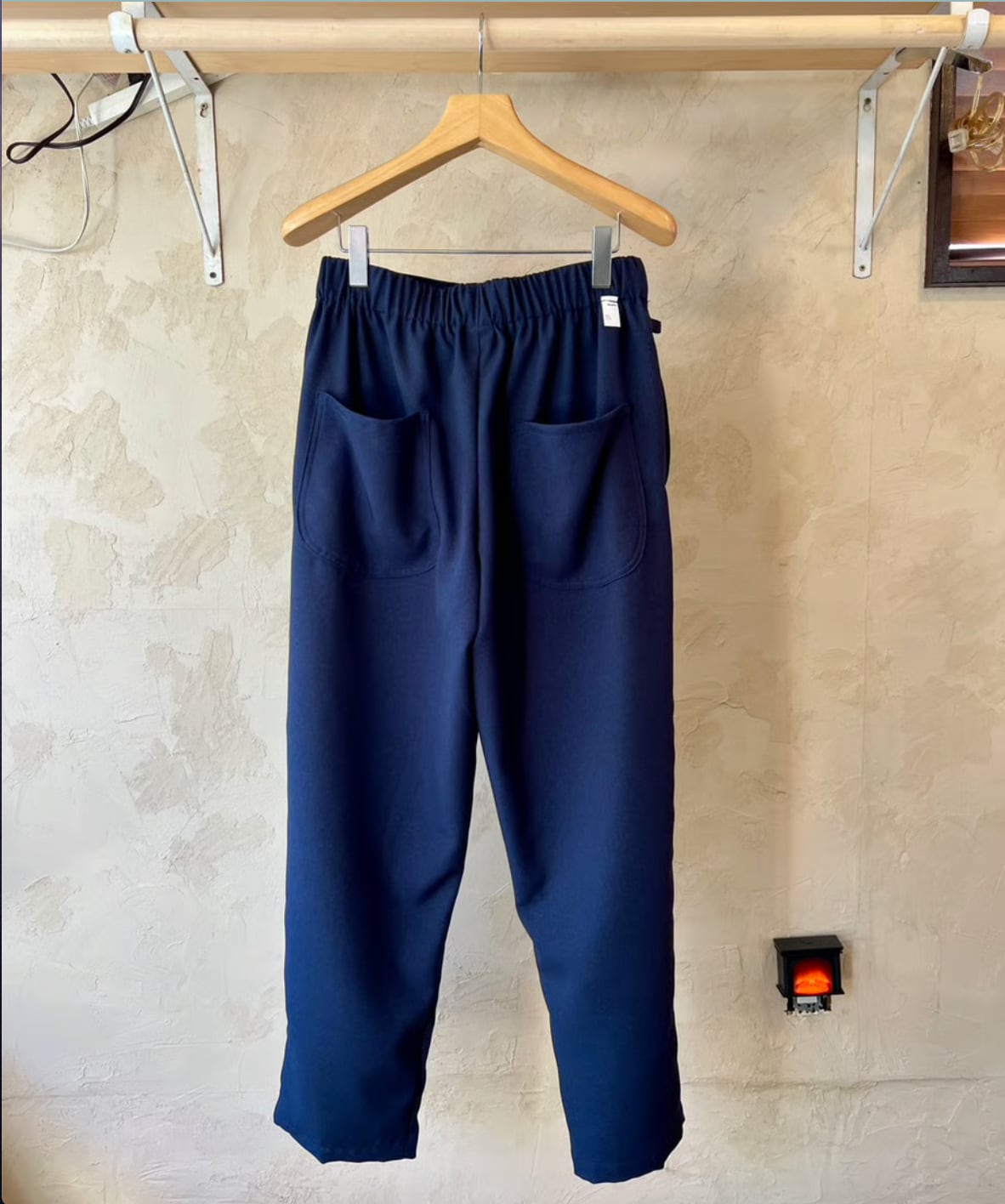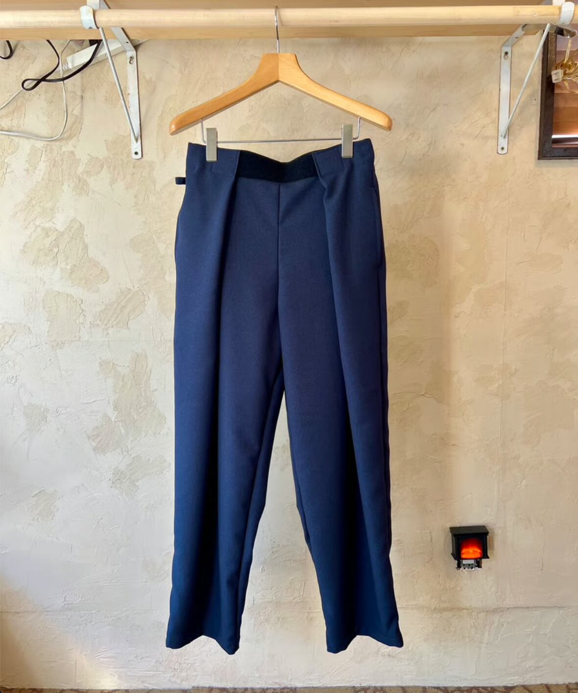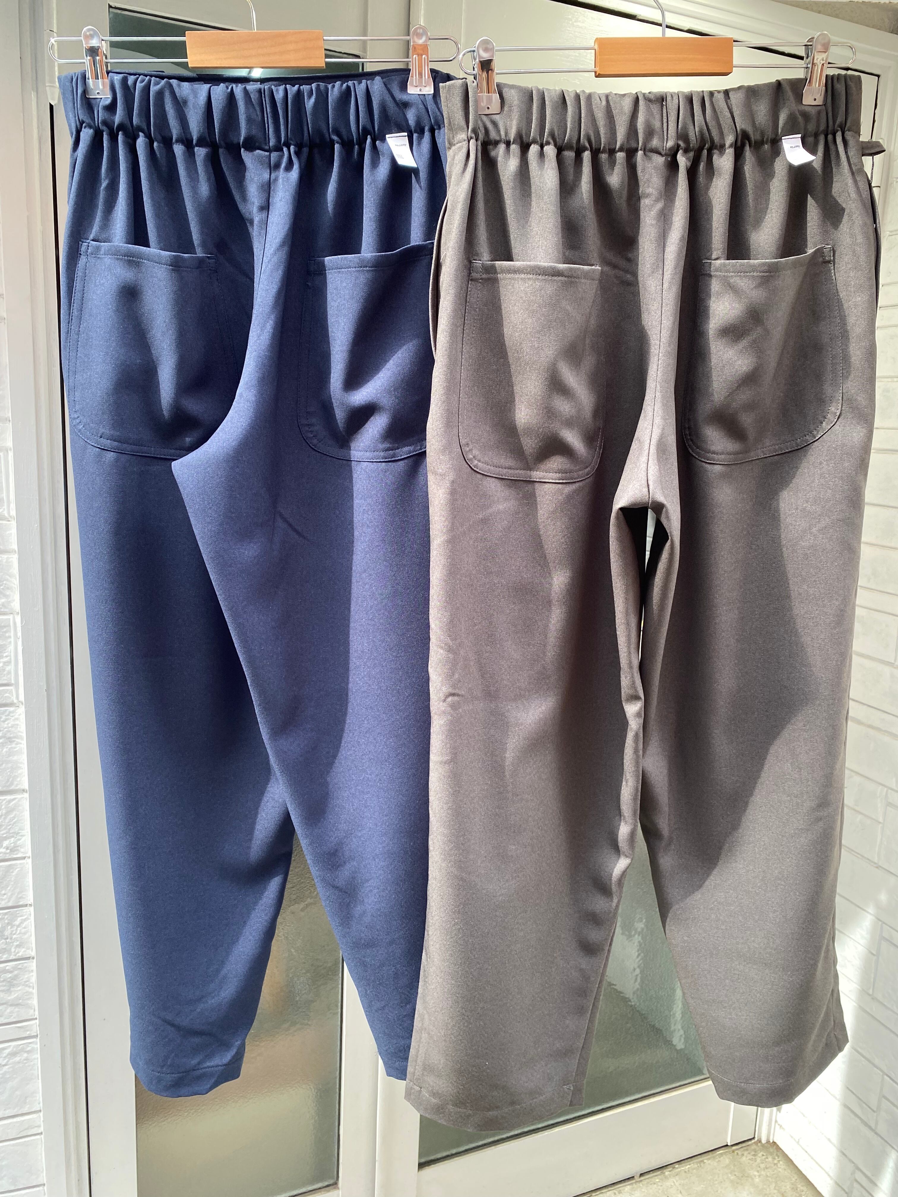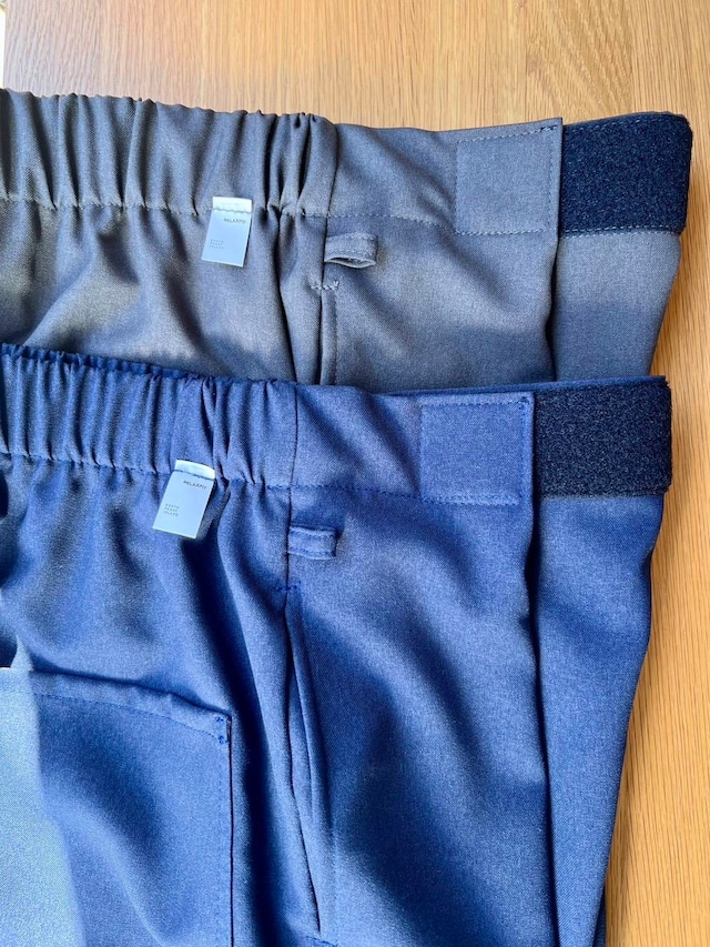 そしてこのパンツの特徴はウエストはマジックテープで両サイドから引っ張り前で止めるタイプでウエストは62〜102cmまで対応なのでほぼ全ての人に対応可。深いタックが入ったパンツ風になるので綺麗な雰囲気でも履いてもらえるのかなと。丈が約100cmで普通のパンツにしては気持ち短めですが靴が良い感じに"say hello"するのでそこがむしろ良い。右腰にキーループが1つ。バックポケットは2つでいう事なしです。カラーはネイビーとチャコールグレーの2色。