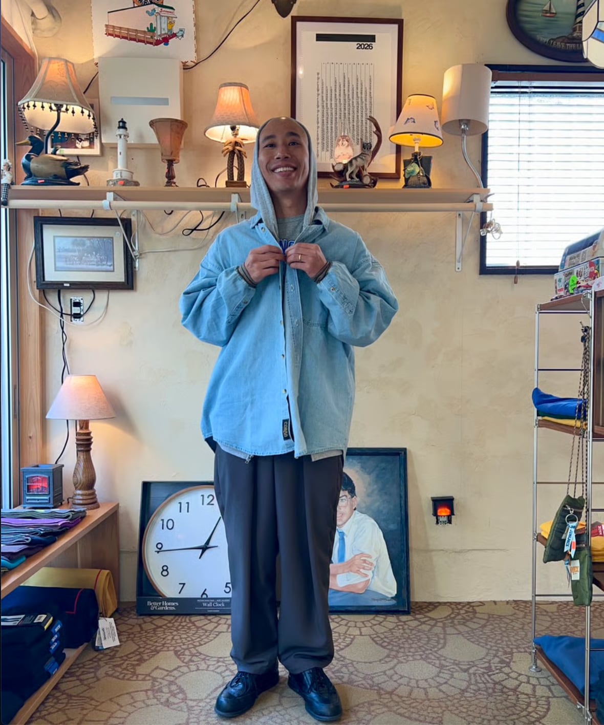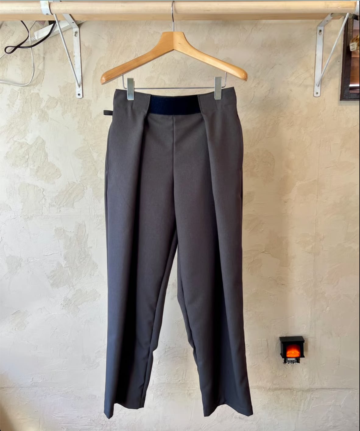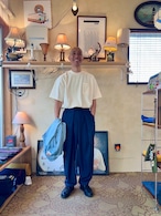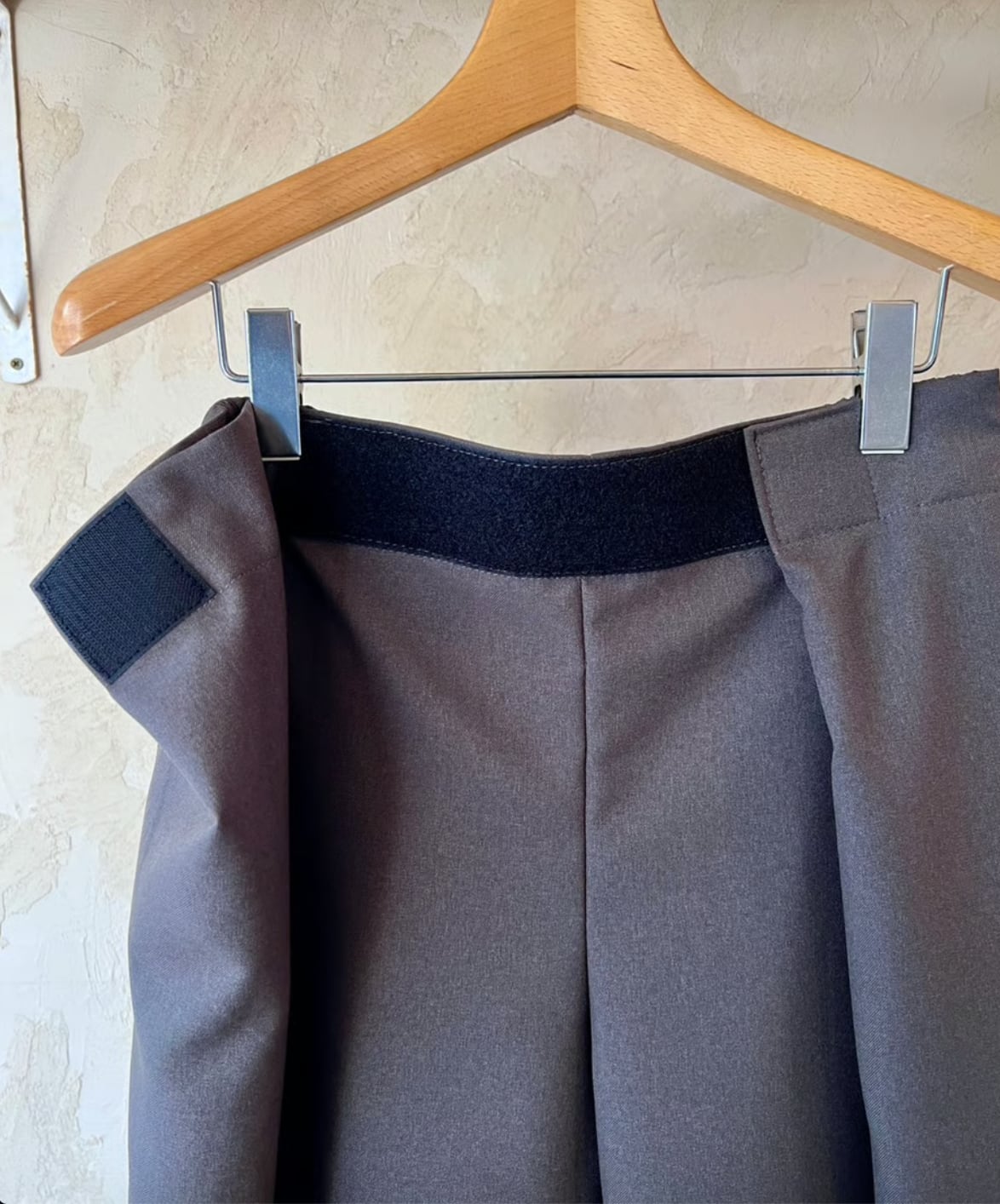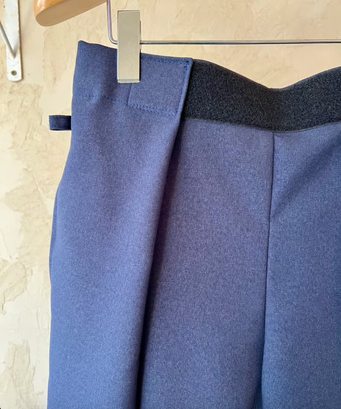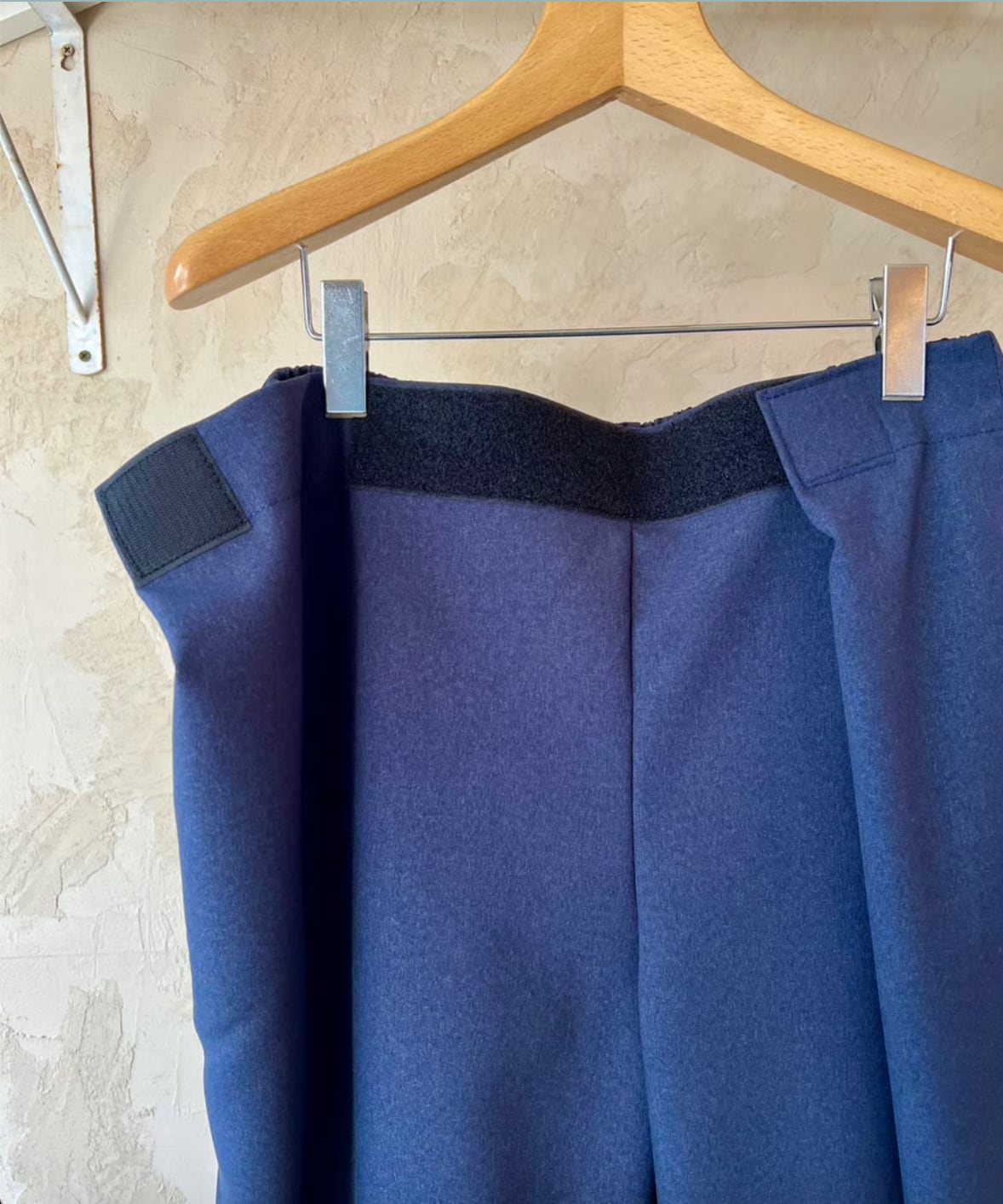 そしてこのパンツの特徴はウエストはマジックテープで両サイドから引っ張り前で止めるタイプでウエストは62〜102cmまで対応なのでほぼ全ての人に対応可。深いタックが入ったパンツ風になるので綺麗な雰囲気でも履いてもらえるのかなと。丈が約100cmで普通のパンツにしては気持ち短めですが靴が良い感じに"say hello"するのでそこがむしろ良い。右腰にキーループが1つ。バックポケットは2つでいう事なしです。カラーはネイビーとチャコールグレーの2色。