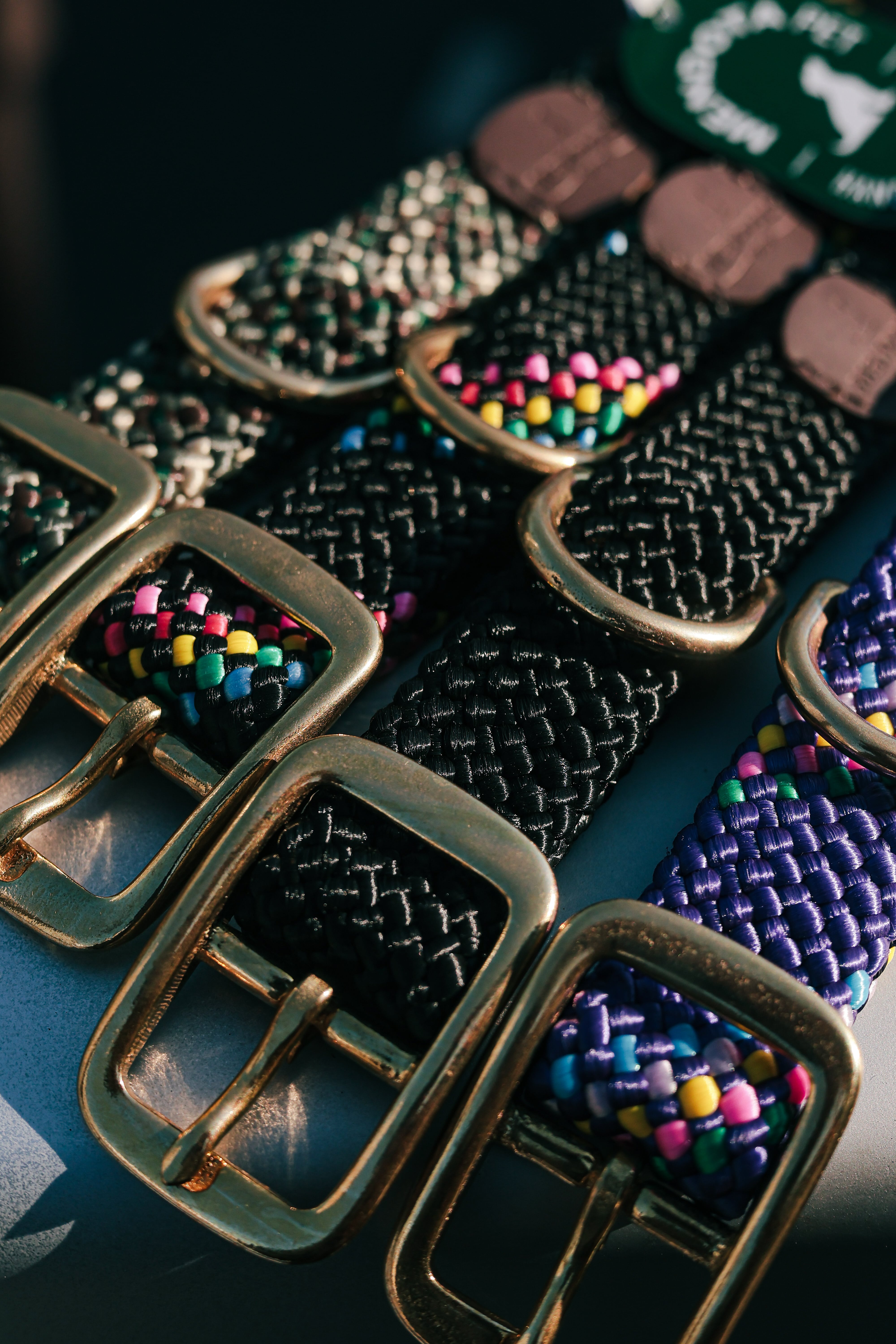 編み込みベルトなので決まった位置で閉めなくて良いのが便利なところですね。真鍮バックルとリードを付けられるDカンまで付いてます。シンプルブラックからカモ柄っぽいやつ、少しカラフルなやつと4カラーあります。