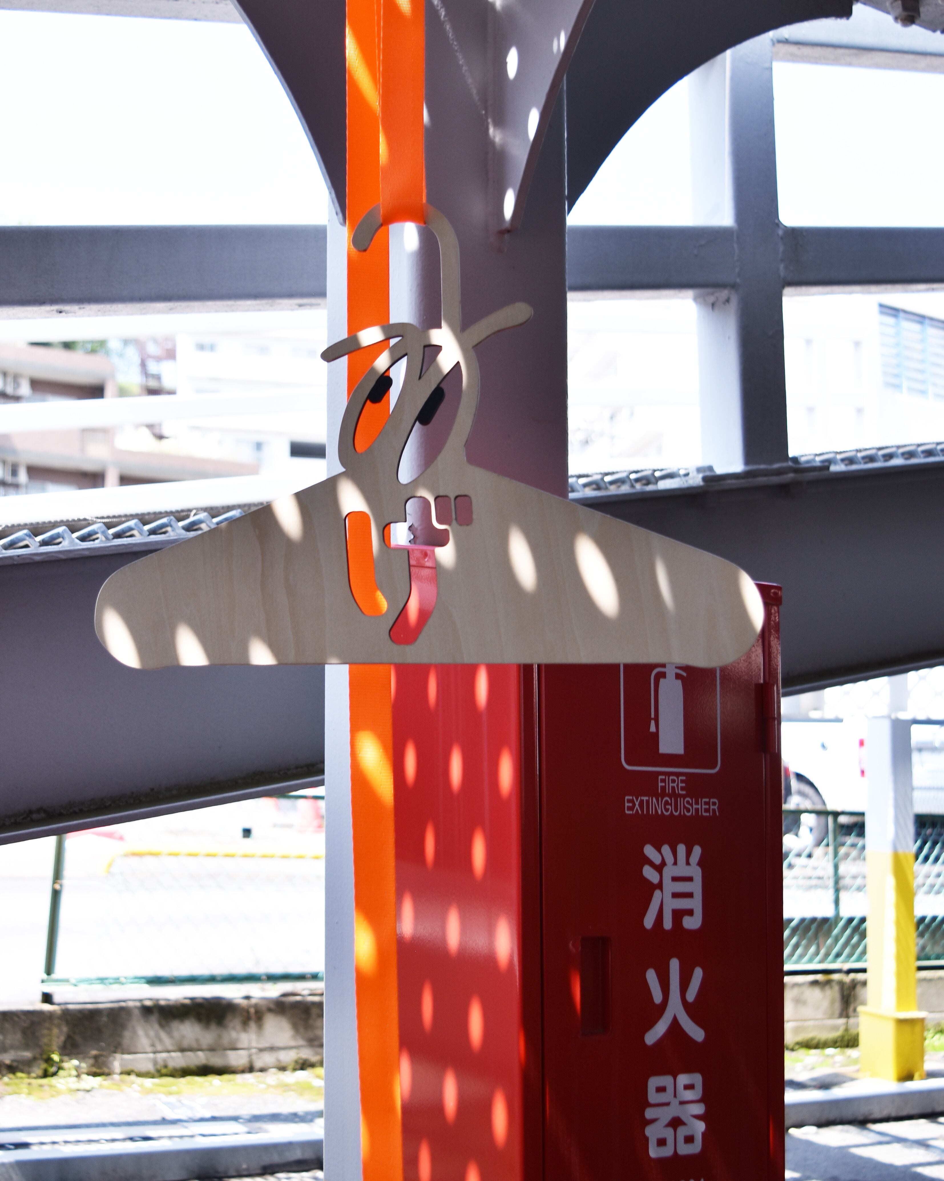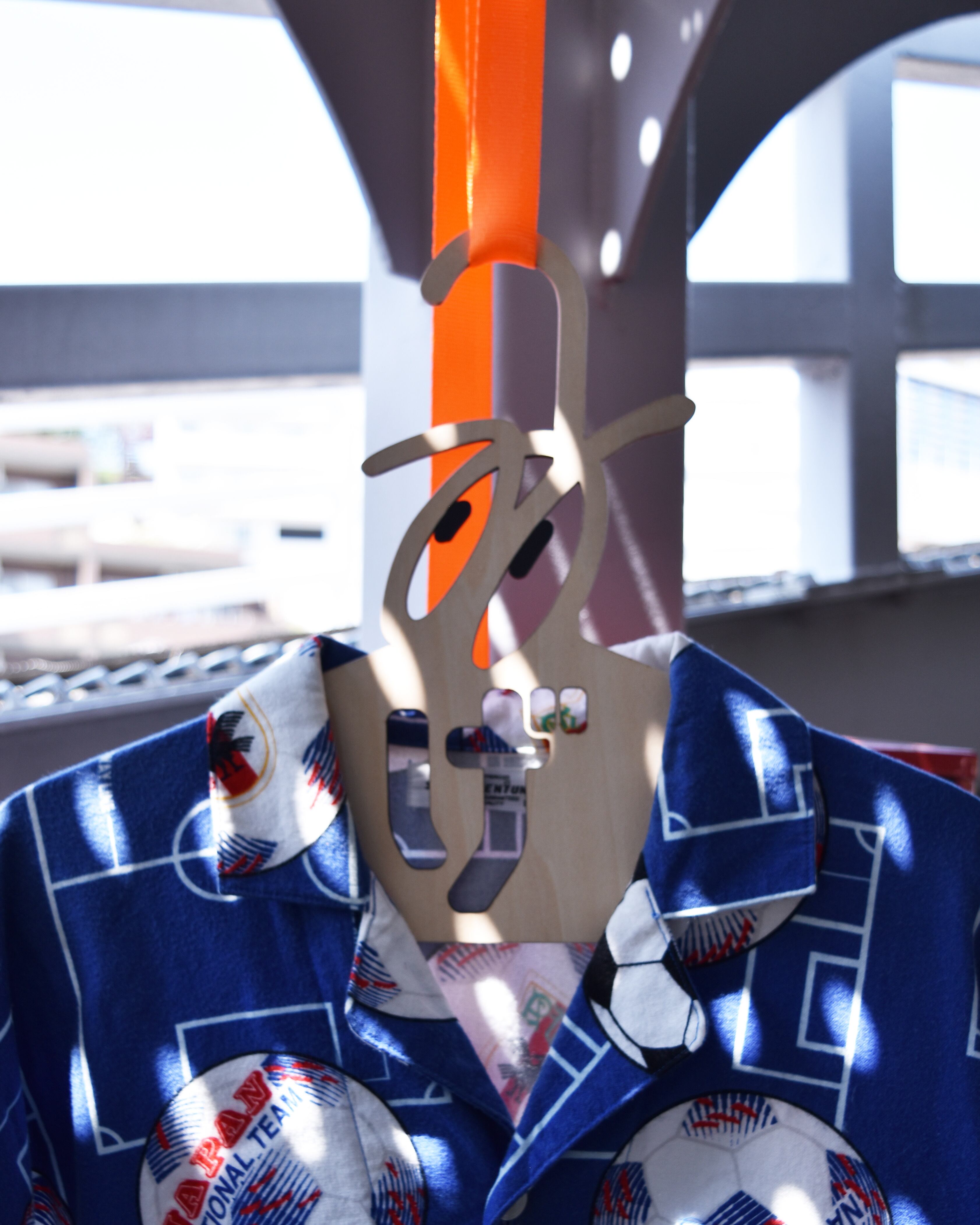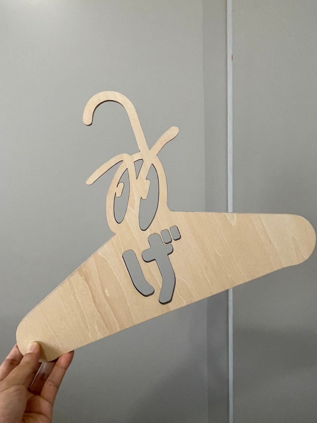 アーティストのOKIさんと作ったコラボハンガー。こちらはOKIさんの描く目のデザインを"の"に見立てて作ってもらった木製のハンガーになります。