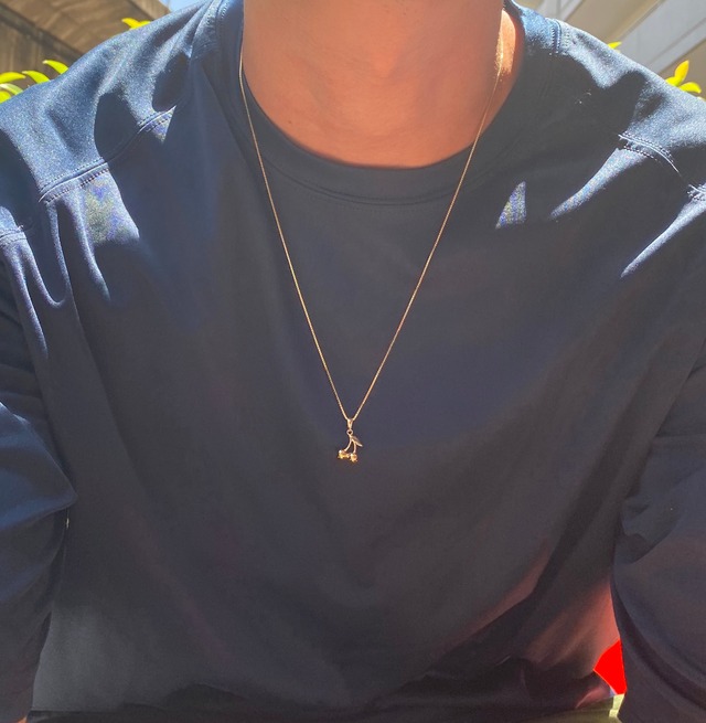 チェリーモチーフのネックレスは探せばあるはあるんだけれど基本レディース用なのでデザインが可愛すぎちゃったりデフォルメされていてメンズは付けづらい。けど、付けたい。そんな思いで今回は男女共に付けやすく強度を保てる範囲で繊細にリアルにを意識して作りました。この感じありそうであんまりないかと。NEW YORKのスケーターがつけてそうな感じ、をイメージしてます。