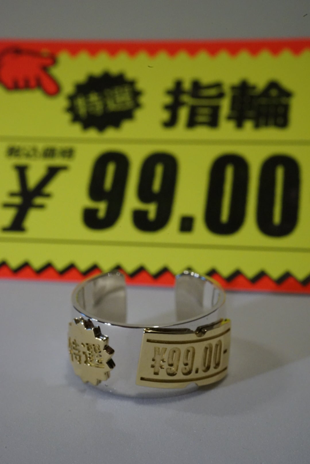 IN-PUT-OUT初のシルバーと真鍮を組み合わせたリングです。モチーフはド○・キ○ーテなんかで見かけそうなPOPのデザインやミニ四駆の箱や菓子パンに貼ってありそうなプライスシール。プレーンなリングに"特選"シールと"¥99.00-"プライスシールを貼り付けたイメージで作られています。