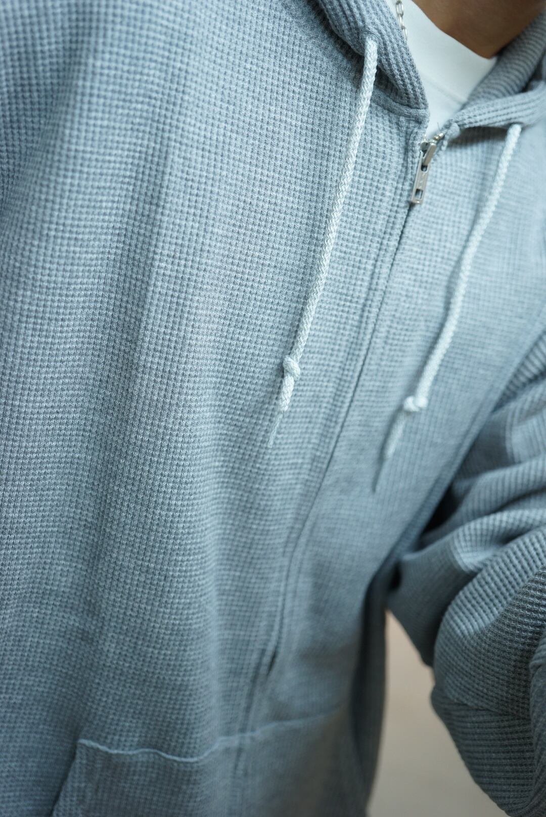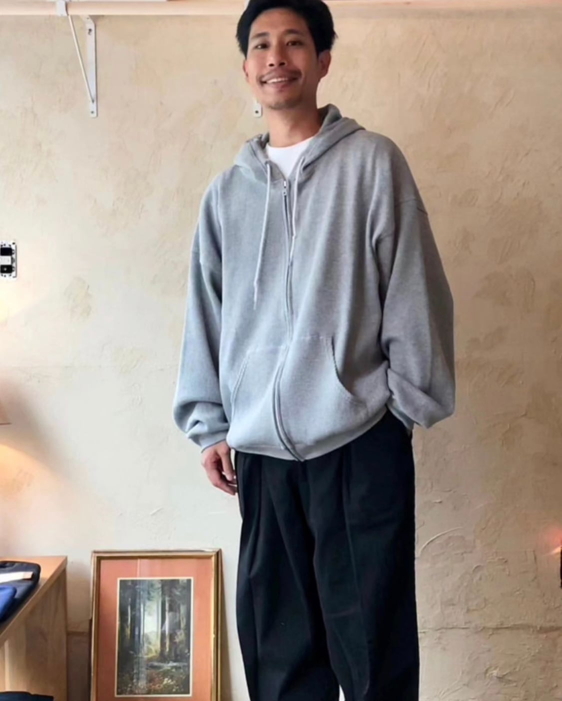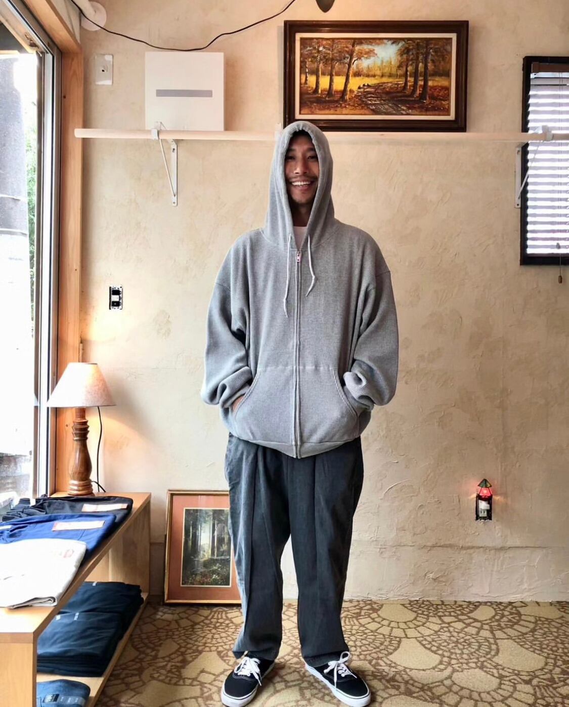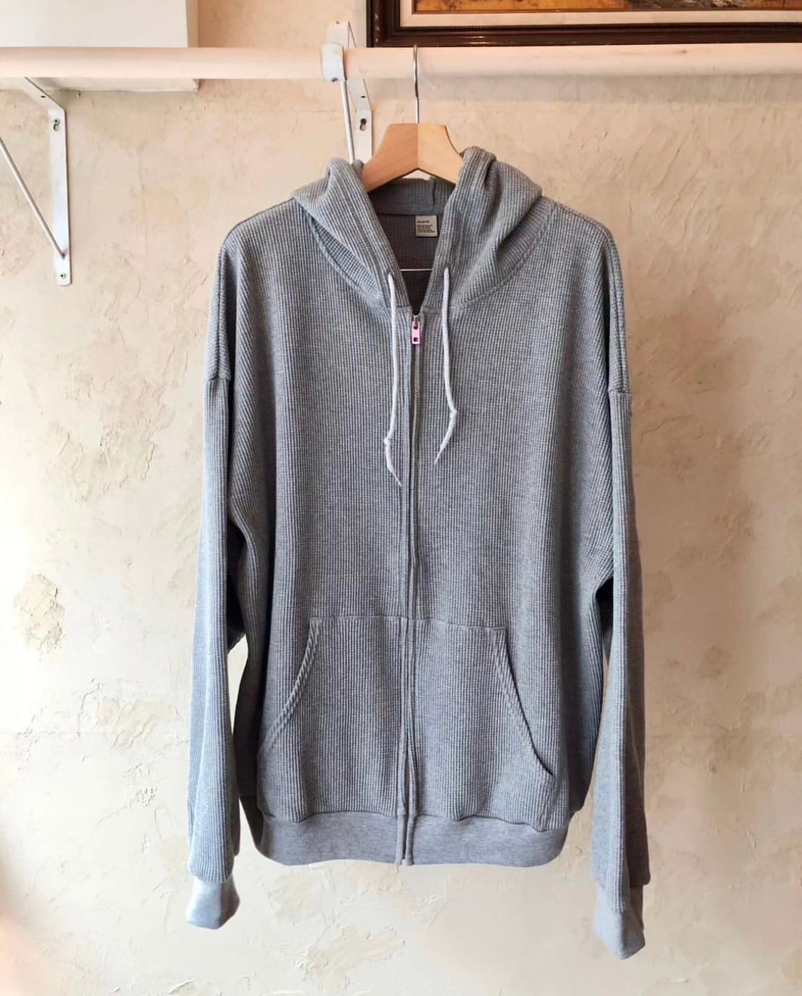 グレーのサーマル生地を使ったパーカーです。ありそうでなかったアイテム。柔らかめのサーマル生地なので着心地優しくてゆったりシルエット。これからの肌寒い季節のちょい羽織ものとして凄く使えそう。もっと寒くなってもアウターの下に着れますね。肌寒い日はとりあえずこれ選んじゃいそう。