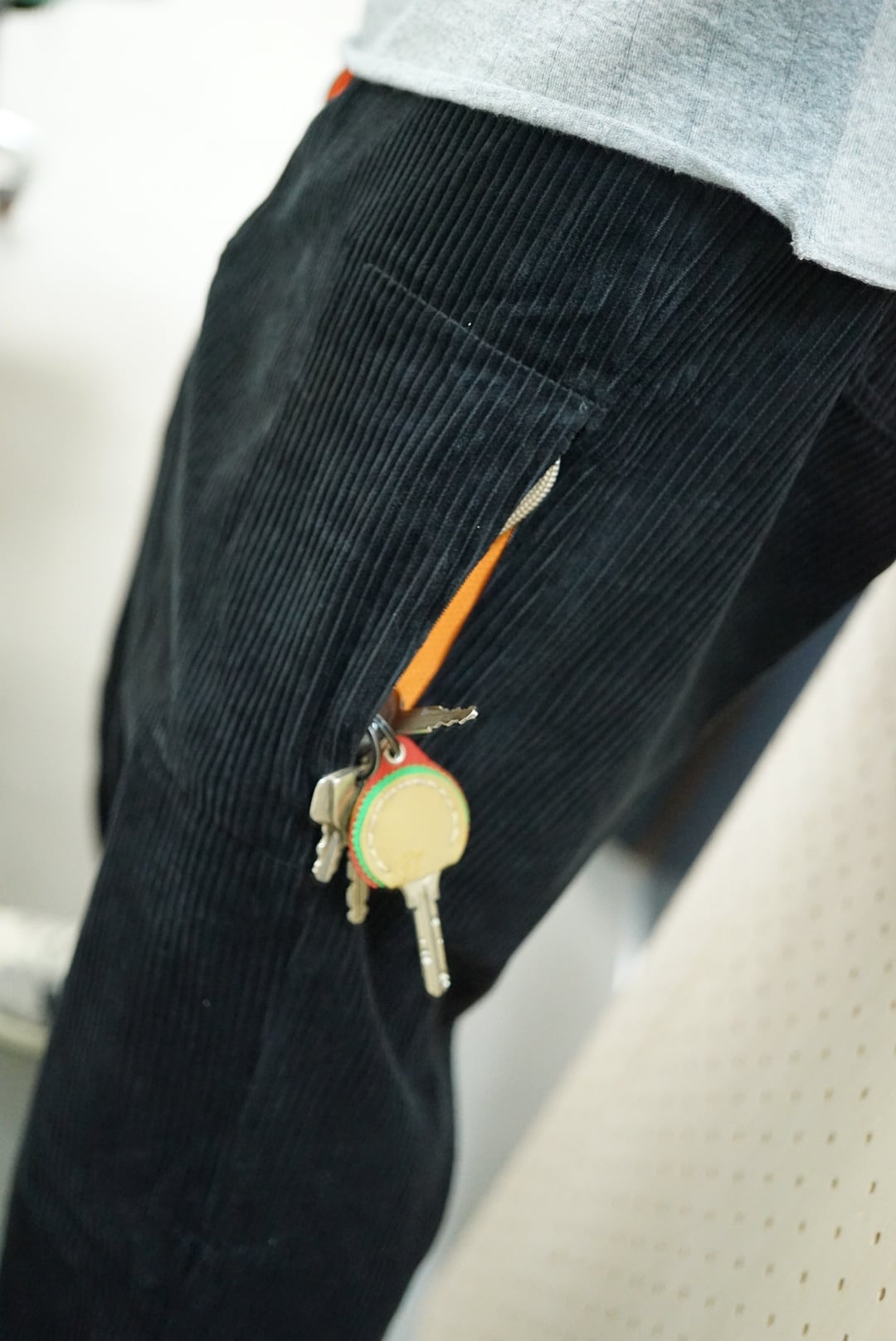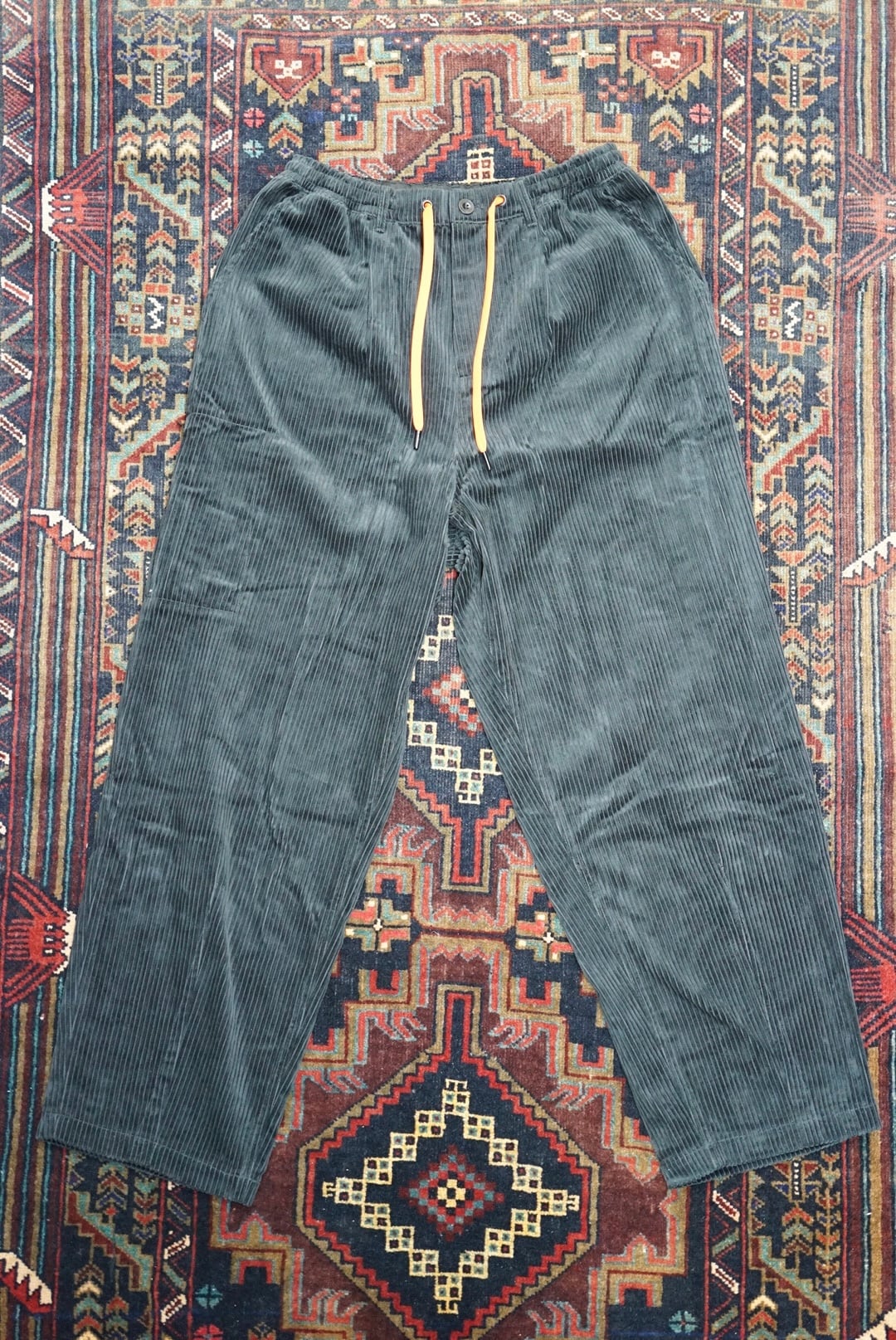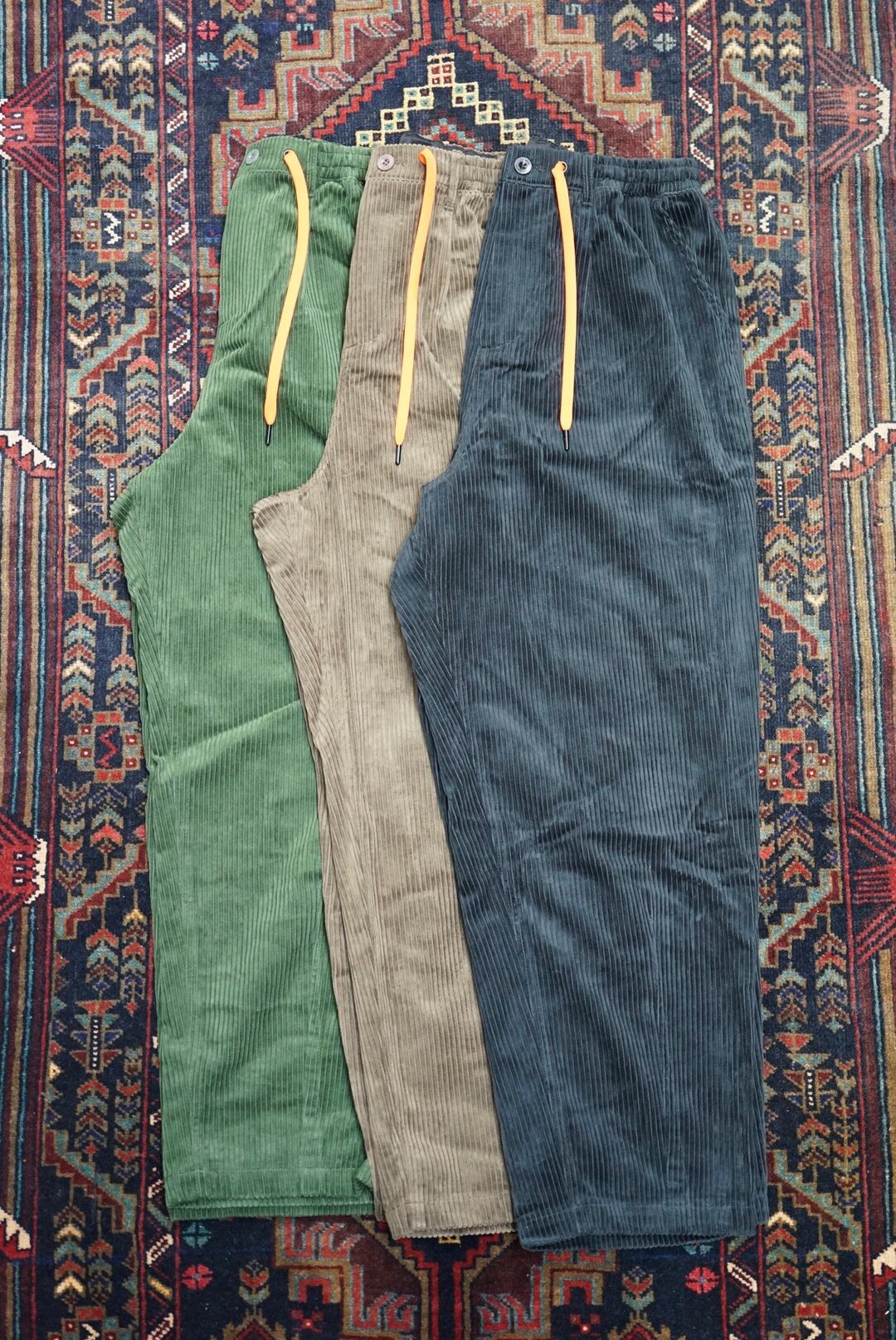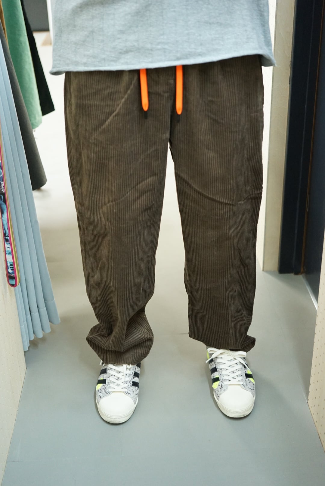 柔らか太畝コーデュロイにアクセントになるセーフティーオレンジの紐が付いたパンツ。ゆったりシルエットながら裾にかけて程良くテーパードが効いてます。