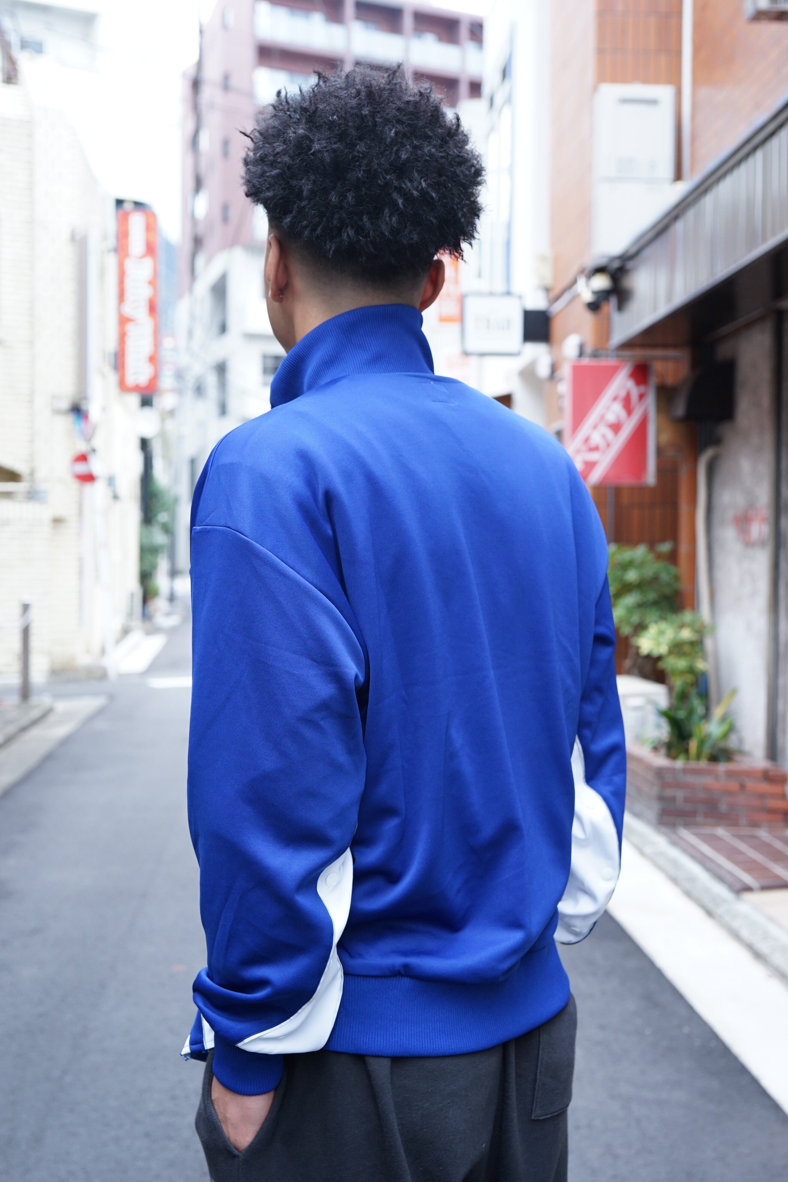 光沢のあるビンテージのジャージーに近い日本製の素材をチョイスされていて脇にあるボタンの付け外しで何通りもの表情が楽しめる仕様になってます。ボタン外すと中の色が違うのがポイント。ボタンのラインに沿ってリフレクターのパイピングがされていて細かな拘りが詰まってます。
